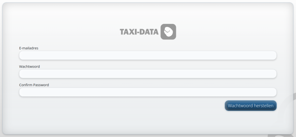 Vul jouw e-mailadres in en druk op “E-mail wachtwoord reset link”. Je ontvangt dan een e-mail van “TaxiData” met de wachtwoord reset link. Druk op de link in de e-mail om naar de wachtwoord reset pagina te gaan: